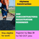 What happened: The NDDOT issued a new notice that Disadvantaged Business Enterprise (DBE) subcontractors on state highway projects must register as subcontractors (if not already) by December 31, 2025; registration expires and must be renewed from Jan 1, 2026 onward. NDDOT