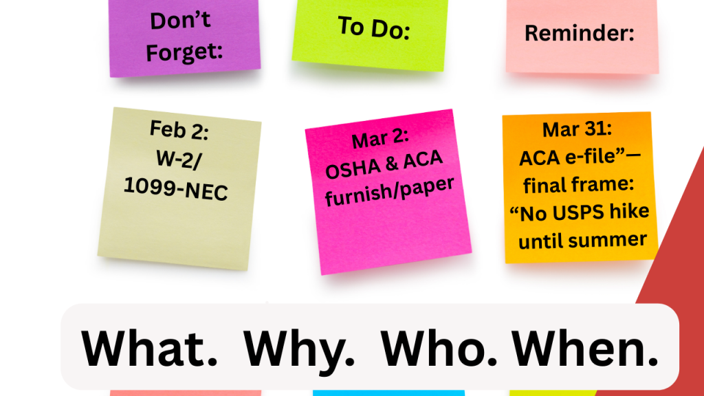 What happened: Furnish ACA forms to employees by Mar 2, 2026; paper filing of many information returns (e.g., 1096+1099 aggs) also Mar 2, 2026; ACA e-filing due Mar 31, 2026.